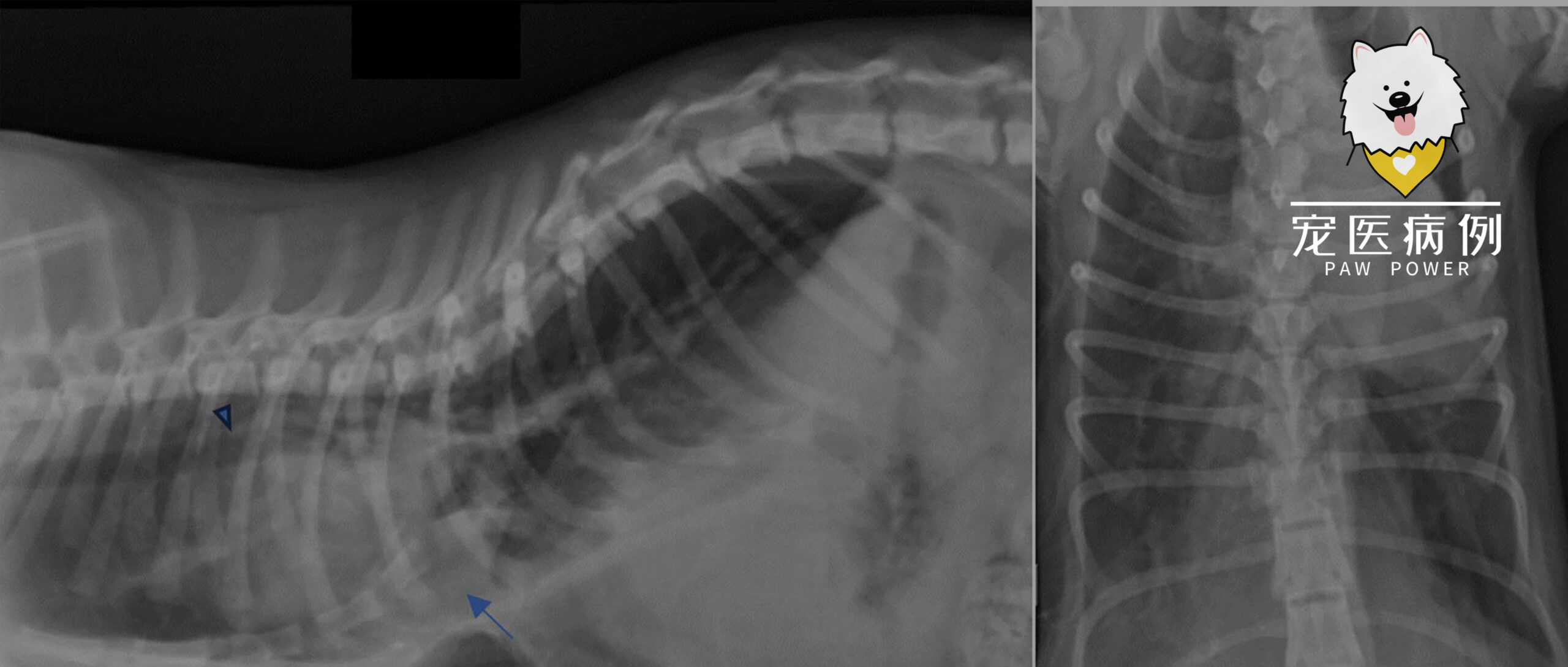体重1.85千克。表现出混合性呼吸困难,呼吸费力,张口呼吸。听诊时发现有轻微的弥漫性呼吸困难,右侧胸腔心音低沉。触诊发现胸骨尾部沿纵轴向背侧凹陷。