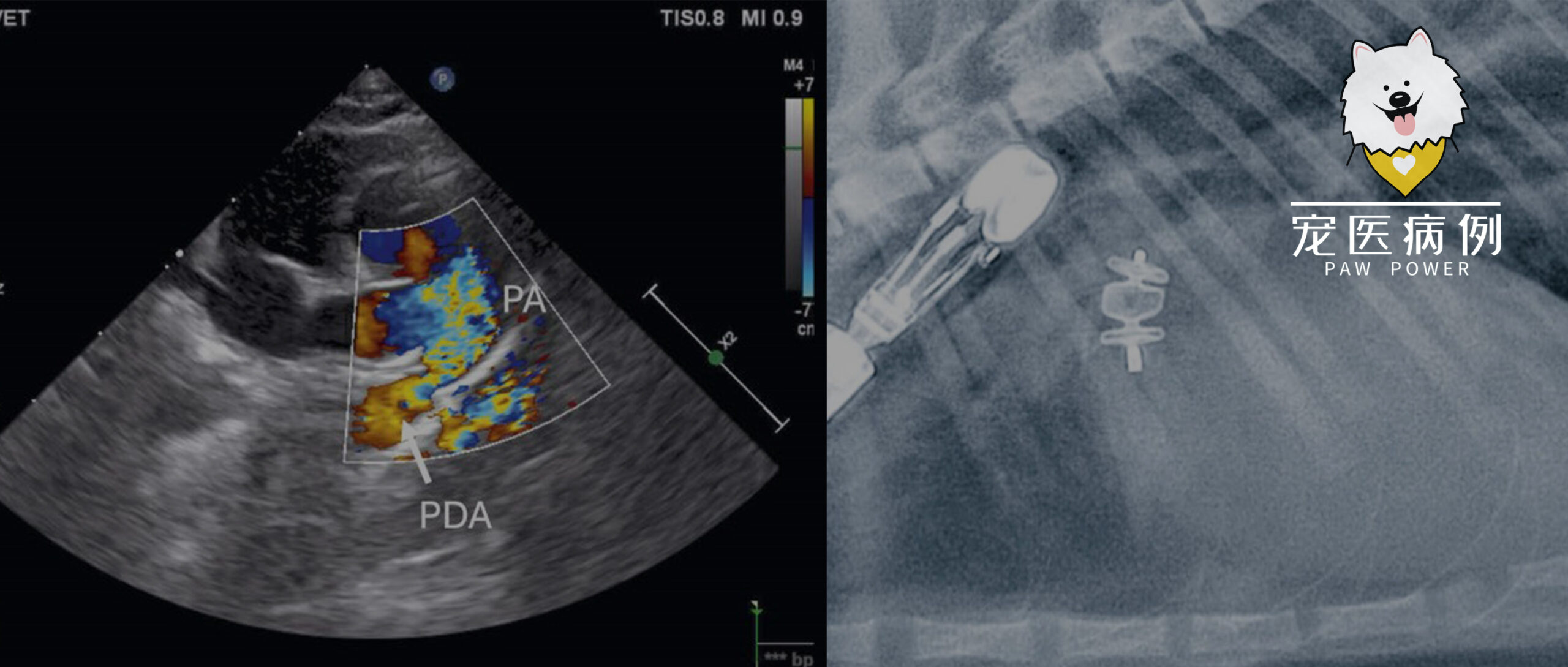 建议主人进行经血管内栓塞或开胸手术结扎,他们决定选择前者。4周后计划对PDA进行微创闭塞。当时体重为3.2千克。