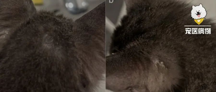 体格检查发现,头部(下图a)、背部、胸部、耳后(下图b)、爪子(下图c),特别是鼻子周围有多处脱毛、无红斑和鳞屑的斑块。皮损轻度结痂,没有深部脓皮病或全身性疾病的迹象。