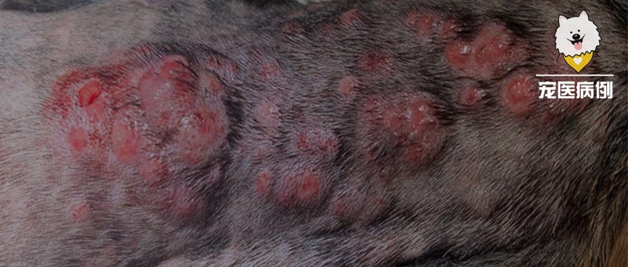 ↑ 背部和颈部区域,存在凸起和潮湿的丘疹。剃掉毛发以评估病变的程度并进行穿刺活检。