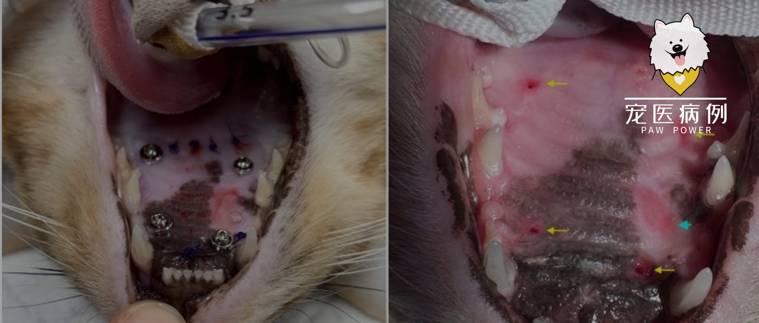 ↑(a)手术时的口腔和(b)移除上颚防护罩后。螺丝孔(黄色箭头)和愈合溃疡(蓝色箭头)很明显。