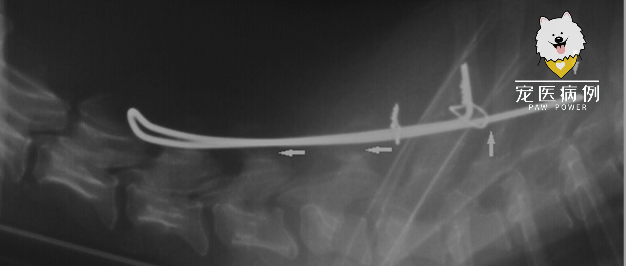 术后1个月,可以走动,但难以站立,并且经常发出疼痛叫声。复查显示前肢麻痹,并出现颈部疼痛症状。X线检查发现克氏针订书钉的头端已经迁移到C4椎骨弓下(下图),这被认为是再次手术的指征。