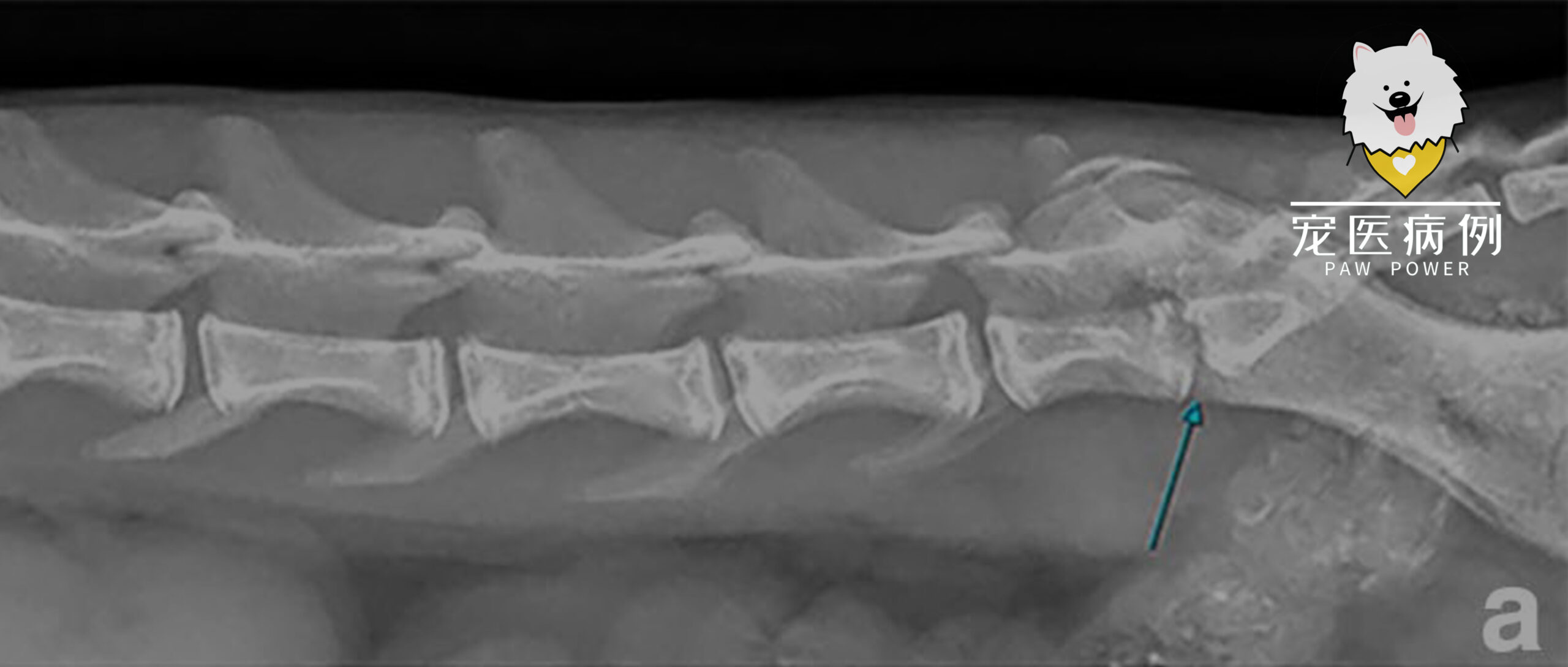 全麻下进行脊柱、胸椎和后肢X光片,显示椎体终板不规则,T12-T13和L7-S1处椎间盘间隙变窄,符合椎间盘炎(下图a)。