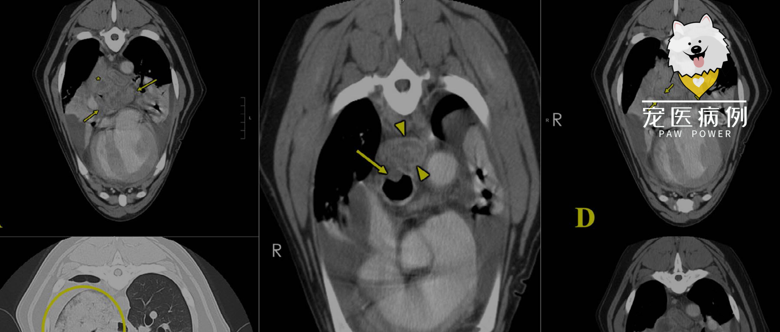 ↑ (A)CT显示右后肺叶(黄色星号)内有一个异质性增强肿块,毗邻肿大支气管淋巴结(箭头之间)。(B)右后肺叶显示密集的肺泡模式(黄色圆圈)。(C)食管增厚(三角之间)和气管背膜中度增厚(箭头)。(D)右后肺叶支气管明显变窄,支气管周围和支气管软组织明显增厚和边缘增强(箭头之间),而左后肺叶支气管受到的影响较轻(箭头之间)。(E)右后肺叶支气管内存在液体(箭头之间)。