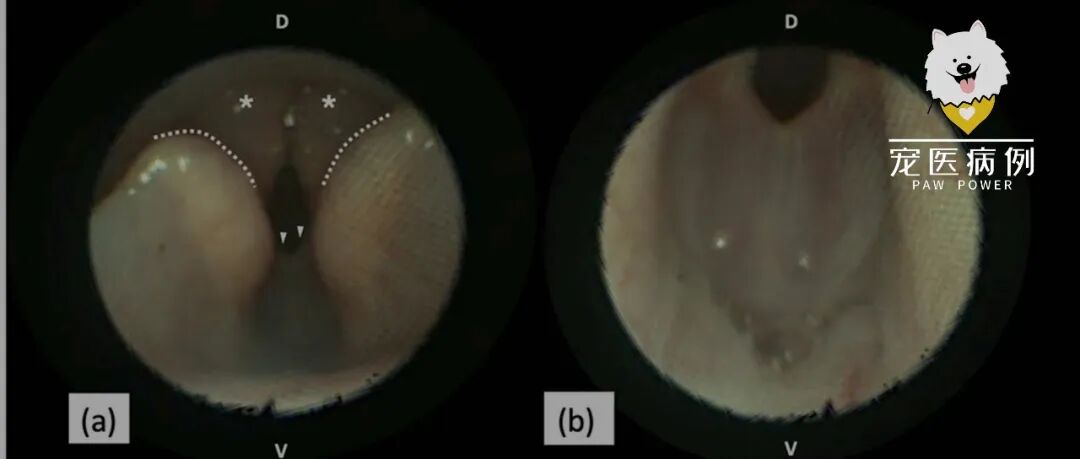 在治疗方面,由于犬的临床症状并未严重影响其生活质量,且初步排除了喉部肿瘤的可能性,主人选择不进行进一步的诊断和治疗。4年后的随访显示,犬的临床症状未发生变化,未出现新的呼吸系统症状。