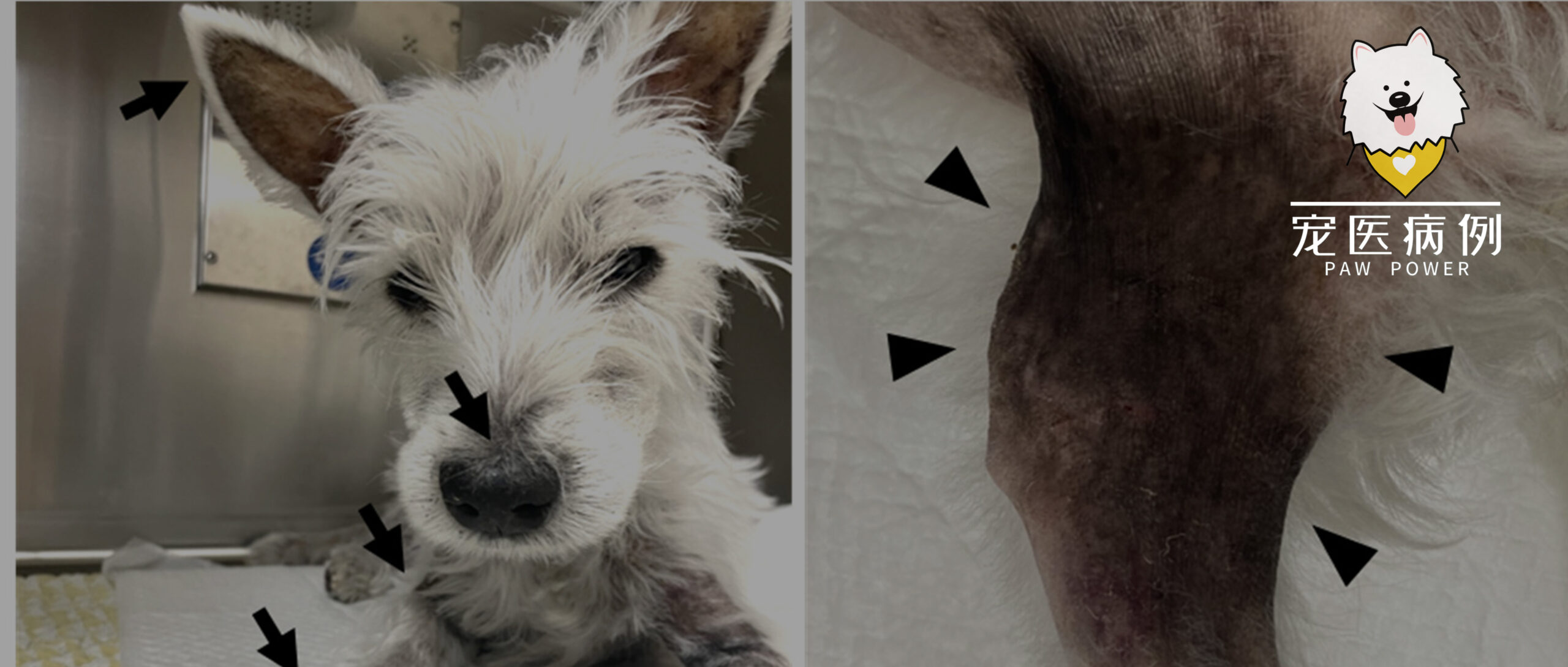 ↑ 在耳廓、口吻部、颈部、腋窝区域和前肢观察到脱毛、皮疹和色素沉着(A;箭头),在腹股沟区域和后肢也观察到这些症状(B;箭头)。
