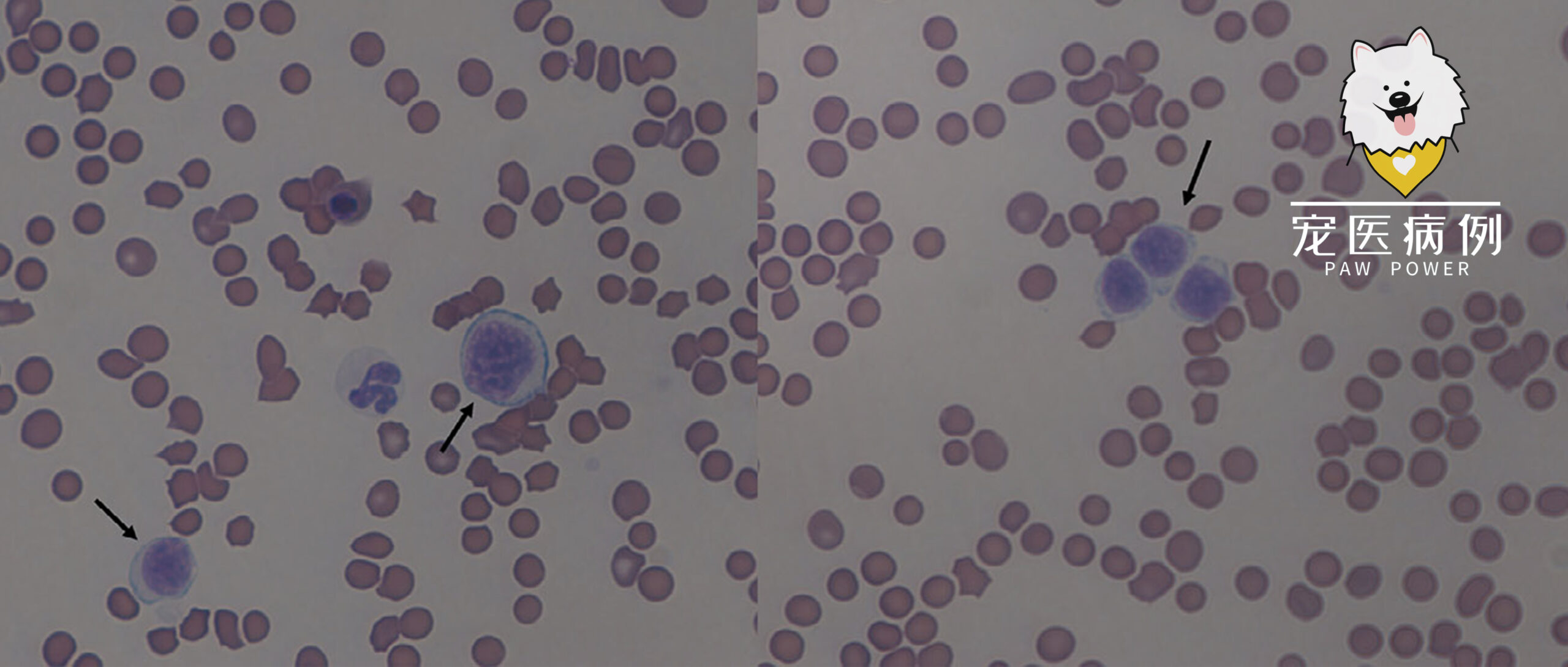 ↑ 外周血涂片。发现多个中等至大型淋巴细胞(黑色箭头)。