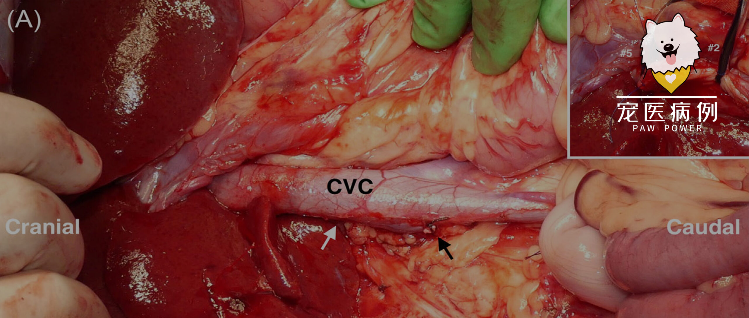 腔静脉采用5-0聚丙烯线以连续缝合模式进行重建。随后释放位于肿块头侧(5号)和尾侧(2号)的止血带,腔静脉恢复正常血流且无出血(下图)。