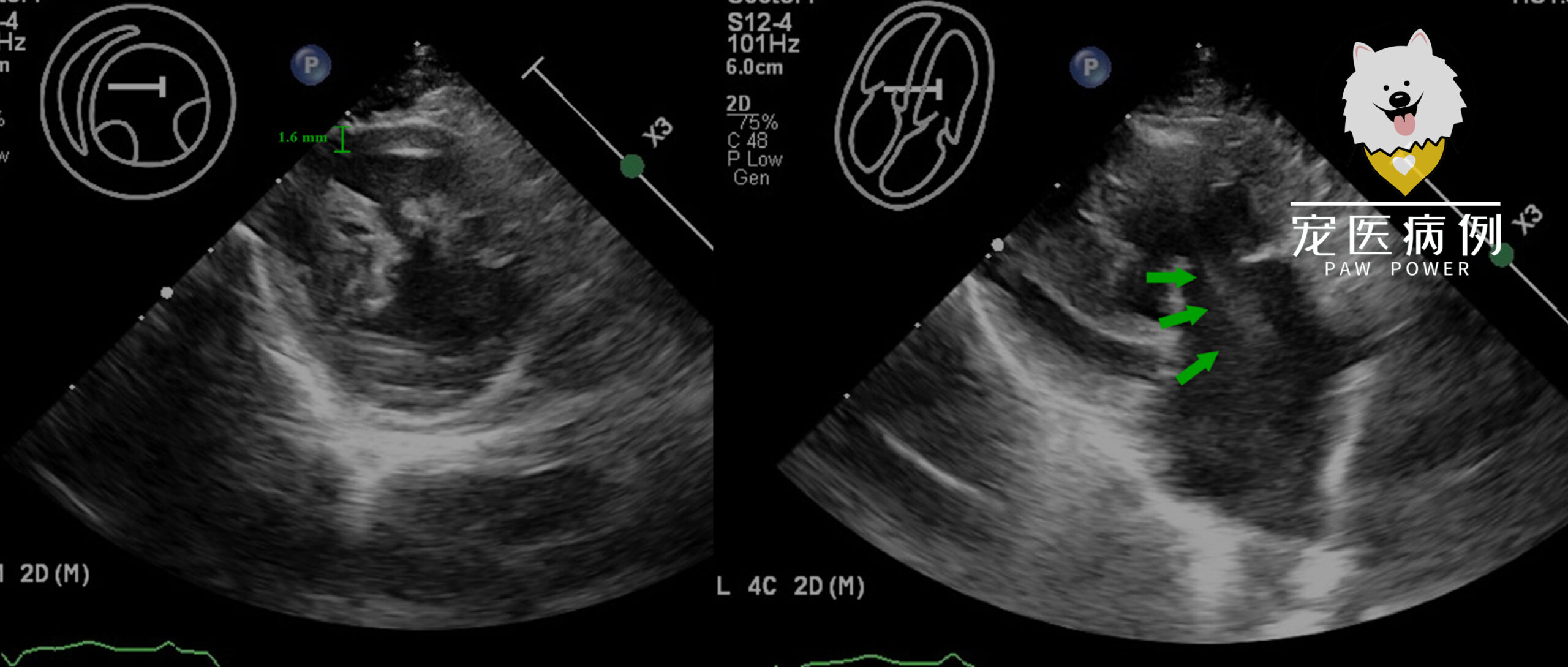 ↑ B型超声心动图图像显示在左心房的左心尖四腔视图中出现自发性超声显影(绿色箭头)。