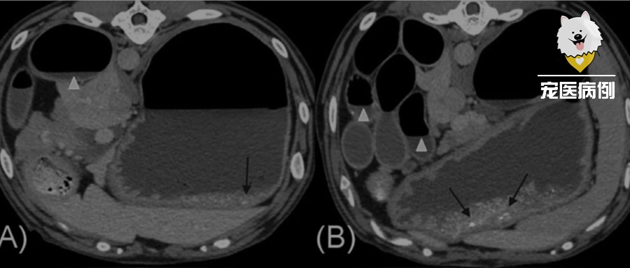 ↑ 横断面对比后静脉期CT图像,所有图像中均可见中度胃和小肠扩张。X光检查中发现的胃内颗粒状矿物质仍然存在(黑箭头)。大部分小肠段内均匀软组织和气体的分层,形成依赖重力的气液界面(白三角)。几个小肠段内有少量颗粒状矿物质和不均匀软组织,但未完全充满肠腔(白箭头)。胃和小肠的肠壁厚度及对比增强均正常。