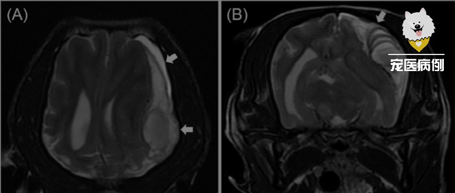↑ 背侧(A)和横断面(B)T2W磁共振图像显示硬膜下血肿(箭头)。左侧大脑半球可见宽阔的半月形病变。中线明显向右偏移,左侧大脑实质和侧脑室受到压迫。周围肌肉或骨骼组织未见信号变化。