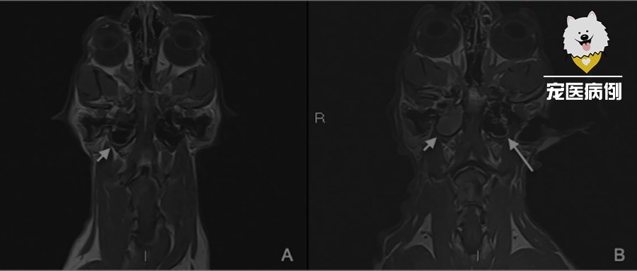 ↑ 术前(A)和术后两个月的MRI检查(B)。增强后T1W背侧图像(AB)显示右侧中耳炎进展(短白色箭头)和疑似左侧早期中耳炎(B,长白色箭头)。