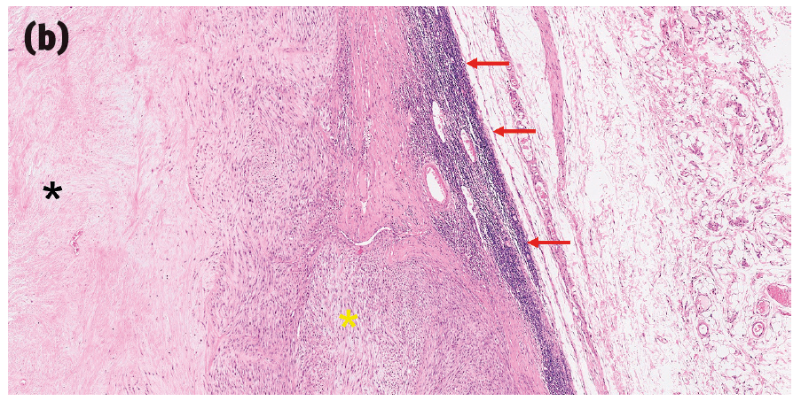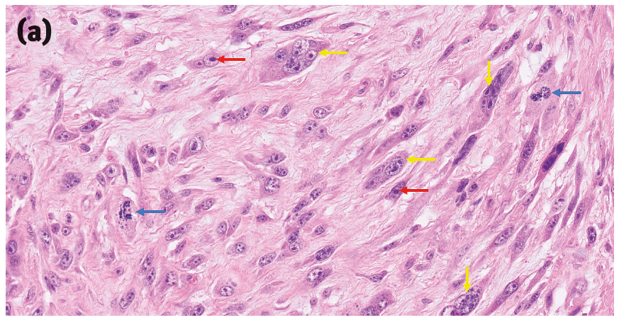 图2. 一些提示猫注射部位肉瘤的组织学特征。(a)肿瘤细胞具有大小和形状各异的细胞核、多核(黄色箭头)、多个大而显著的核仁(红色箭头),以及有时会出现非典型有丝分裂象(蓝色箭头)。(b)猫注射部位肉瘤(黄色星号为肿瘤)有一个大面积的中央坏死区域(黑色星号)以及周边的淋巴细胞带(红色箭头)。(c)猫注射部位肉瘤边缘的巨噬细胞区域,细胞质内有细小的嗜碱性颗粒(蓝色箭头)和淋巴细胞(红色箭头)。