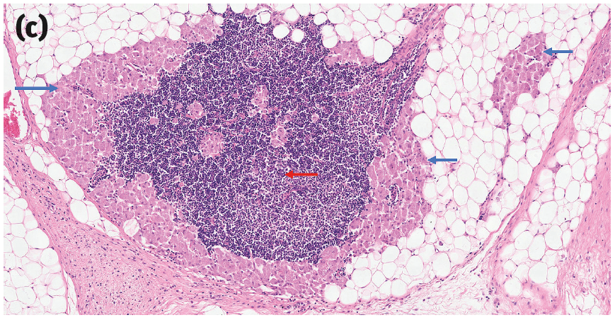 然而,目前还没有明确的组织学诊断标准。相反,它们的诊断通常依赖于一组临床和病理特征,包括肿瘤的物理位置、该部位先前注射或其他创伤的兼容临床病史,以及各种提示性的大体和组织学特征,包括高度浸润性生长、大面积中央坏死、显著的淋巴细胞浸润、肿瘤细胞和巨噬细胞的显著多形性,以及巨噬细胞内有胞浆色素(之前曾被推测为佐剂;图2)。