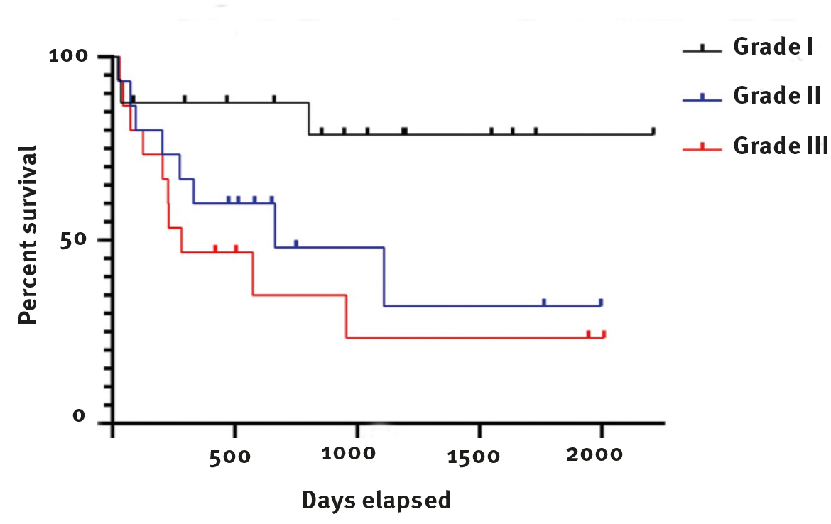 图3. 根据组织学分级的Kaplan-Meier生存曲线。I级肿瘤用黑线表示,II级用蓝线表示,III级用红线表示。标记线表示截断的病例,即在该时间点失访或死于非肿瘤相关原因。