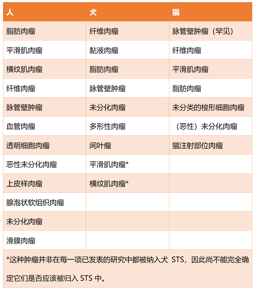 在人类中,STS总体上是较为罕见的肿瘤。血管肉瘤(内皮细胞来源的恶性肿瘤,无论是血管内皮还是淋巴管内皮)被纳入人类STS,但在犬(或猫)STS中,血管肉瘤并不被视为其中的一部分。