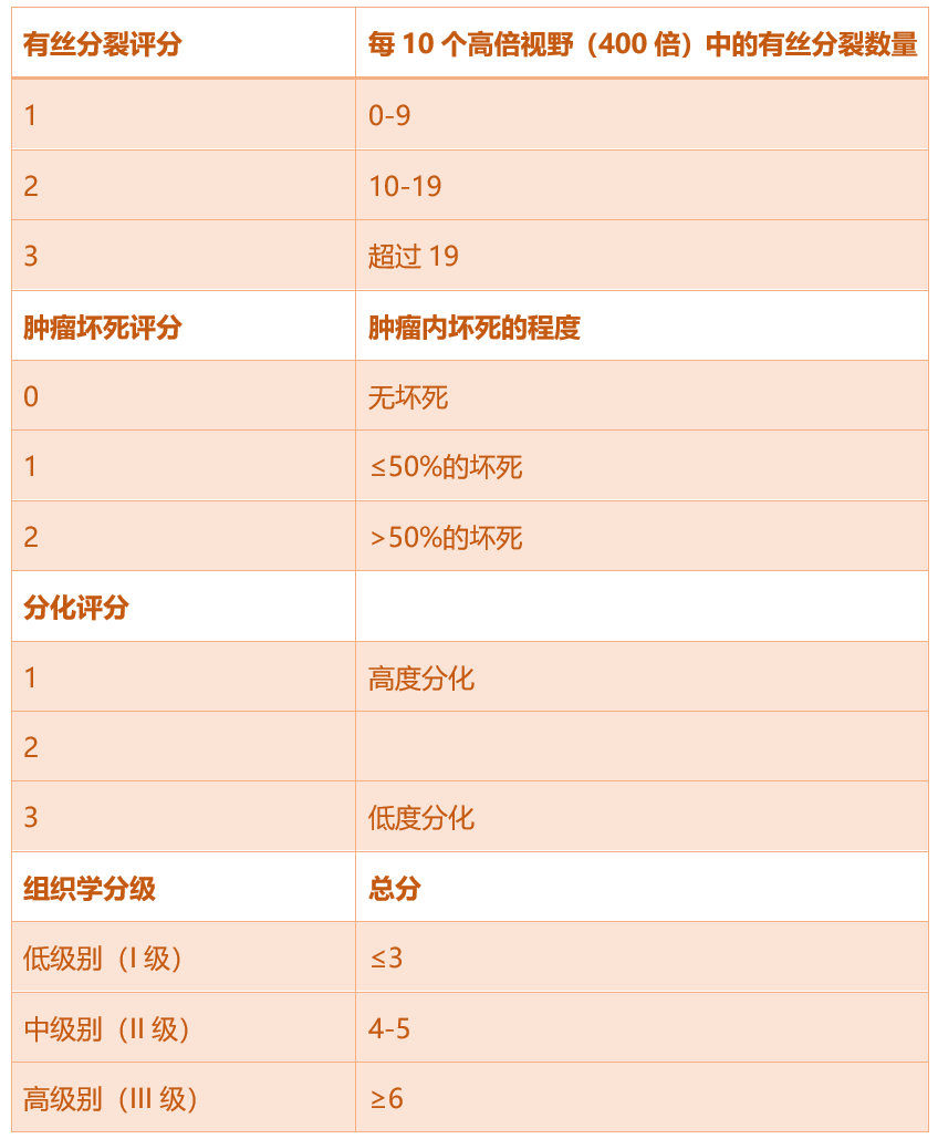 分级系统是为人类STS的预后而开发的。它结合了三个值,一个用于评估肿瘤内是否存在坏死以及坏死的程度,第二个用于评估有丝分裂数量,第三个用于评估一个相对主观的标准,称为“分化评分”——即评估肿瘤细胞与正常组织的相似程度。这三个单独的值相加得出总分,对应低级别(I级)、中级别(II级)或高级别(III级)(表3)。