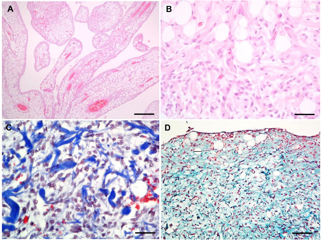 图2. (A) H&E染色:乳头状结构,内含多量血管,周围梭形细胞呈栅栏状排列。(B) H&E染色:单空泡成熟脂肪细胞与梭形细胞同时存在。(C) Masson三色染色:梭形细胞群与粗胶原纤维混杂。(D) Alcian蓝染色:黏液样基质被染色突出。