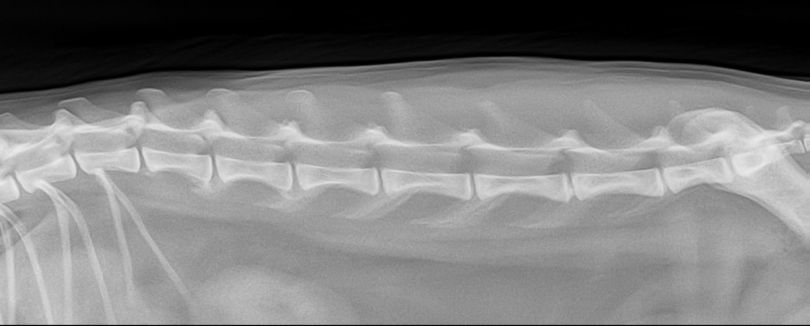 由于患者具有防御性,无法进行体格检查和神经学检查。心脏超声和血液检查,包括血糖和乳酸,均未发现主动脉血栓栓塞等心血管疾病。腰椎和后肢X光检查未发现显著异常(下图)。