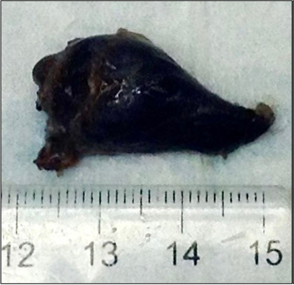 暴露并检查了甲状腺的左右两叶,左右两叶均呈弥漫性黑色。CT上看到的结节位于左侧叶,右侧叶在形状、大小和触诊方面均正常。未见周围组织明显变色,咽后淋巴结也未见异常。由于担心黑色素瘤的可能性,进行了口腔检查,但未发现肿块。