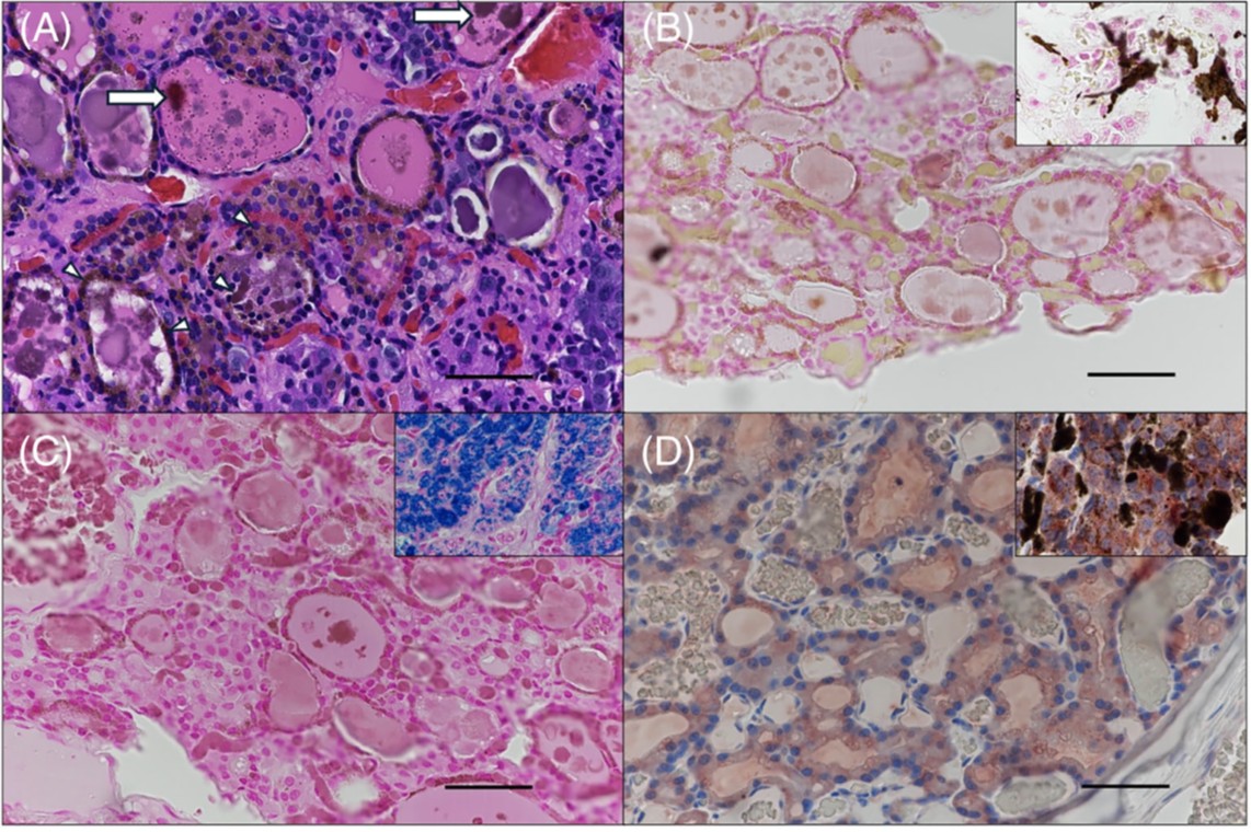 ↑ 受累甲状腺的组织学表现。 (A) 棕色色素以不规则的球体形式存在于胶质中,直径达25 μm(箭头),以1-2 μm直径的细小颗粒形式存在于上皮细胞内(三角)。 (B) 该色素在冯·科萨染色中对钙呈阴性。(C) 在普鲁士蓝染色中对铁呈阴性。(D) 在Melan-A免疫组化中对免疫反应性呈阴性。插图显示了特殊染色和免疫组化的阳性对照。