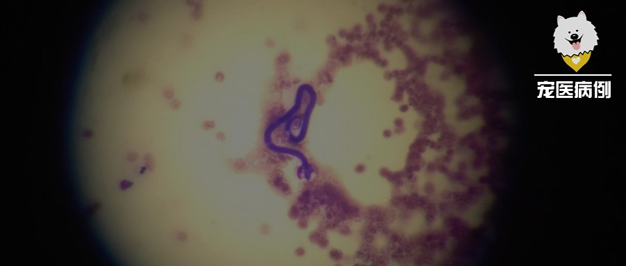图2. 心包积液细胞学显微图像显示寄生虫幼虫的存在。寄生虫的未成熟阶段被炎症细胞包围。