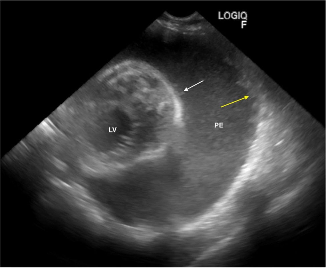 图3. 斜位右胸骨旁短轴投影显示心外膜(白色箭头)和心包(尤其是壁层)上有纤维蛋白沉积(黄色箭头)。还可以看到浓密的、可能是细胞性的心包积液。PE:心包积液,LV:左心室。
