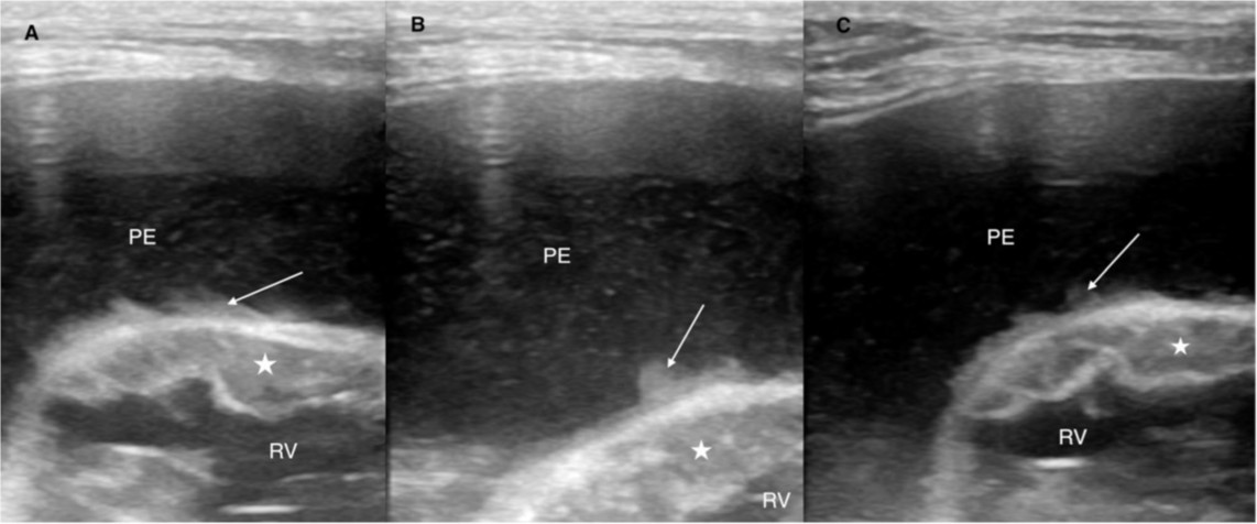 图4.(A-C)心外膜表面的特写视图,显示多个纤维素沉积(白色箭头)。星号表示右心室的游离壁。RV:右心室,PE:心包积液。在A和B中,积液的特征性密度清晰可见。