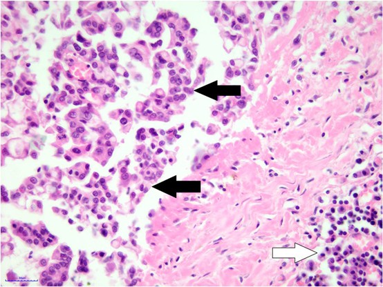 图7. 间皮细胞增生,排列成乳头状结构(黑色箭头),炎症浸润主要由浆细胞和小淋巴细胞组成(白色箭头)。