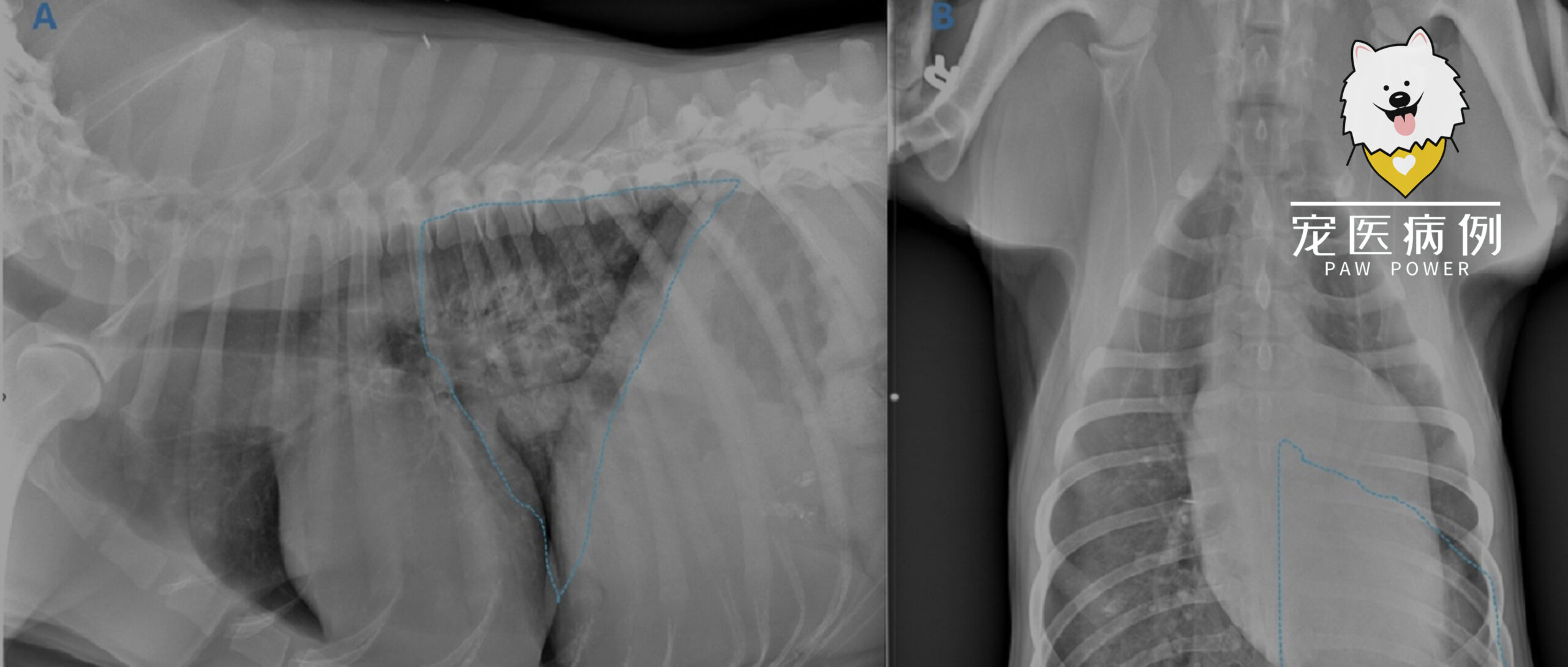 ↑ 右侧位(A)与腹背位(B)胸片:左肺后叶呈混合性间质-肺泡型病变,正常血管边缘消失,可见边界不清的软组织密度增高影(蓝色勾勒)。受累肺叶体积缩小,导致肺后缘向背侧回缩,纵隔向左偏移,于腹背位(B)尤为明显。