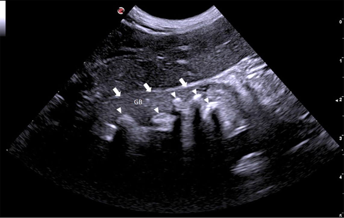 ↑ 腹部超声:胆囊(GB)(箭头)和多个胆结石(三角)。