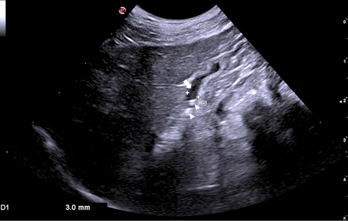 就诊前10天,曾因呕吐、抑郁、厌食和发热住院48小时。腹部超声显示胆囊炎和胰腺炎,胆囊、胆管和肝内胆管中有胆结石(下图)。