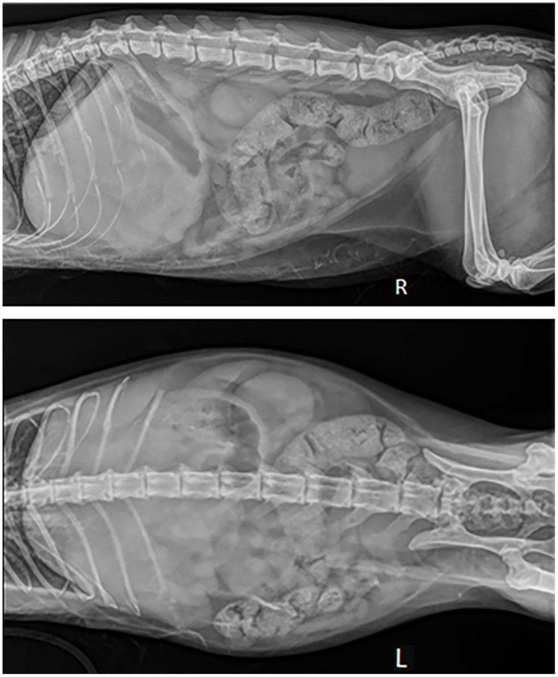 腹部X光片未见异常(下图)。腹部超声显示膀胱为空,肾盂结石但无相关扩张,由十二指肠异物梗阻引起的机械性肠梗阻。胆囊壁增厚,内容物主要呈高回声、不均匀,后方有声影,肝内和肝外胆管内有高回声元素并伴有声影,弥漫性脂肪炎。