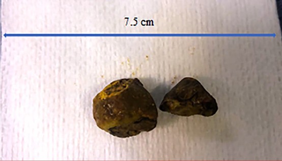 ↑ 通过肠切开术取出的两个阻塞性远端十二指肠结石。其中最大的一个直径为1.5厘米。