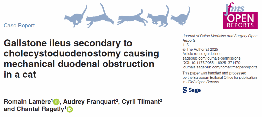 文献来源:Lamère R, Franquart A, Tilmant C, Ragetly C. Gallstone ileus secondary to cholecystoduodenostomy causing mechanical duodenal obstruction in a cat. JFMS Open Rep. 2025 Oct 8;11(2):20551169251371470.