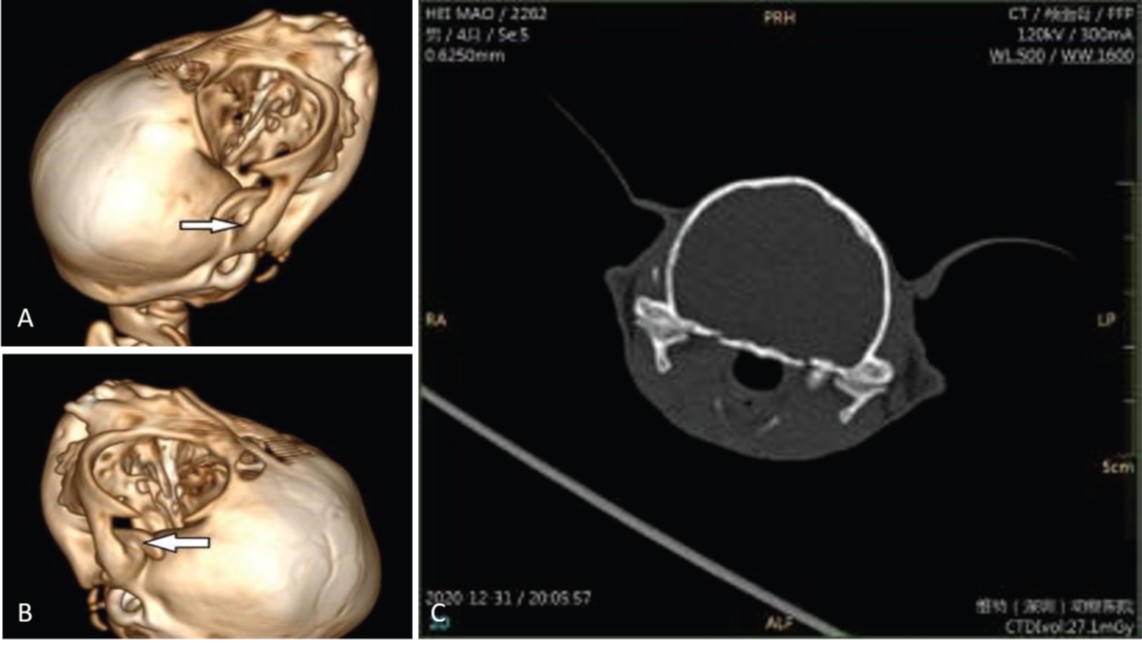 ↑ (A) 三维CT重建,右侧图像,箭头显示右侧下颌冠突和颧弓的畸形融合。(B) 三维CT重建,左侧图像,箭头显示左侧下颌冠突和颧弓的畸形融合。(C) CT二维断层扫描图。