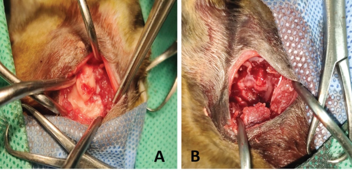 人类TMJ强直手术分“间隙成形、间置物置换、关节重建”三类。小动物因髁突细小,人工假体尚无商品化产品。本例采用“无充填间隙成形术”,双侧一次完成,术中保留关节囊及外侧韧带,避免面神经与下齿槽神经损伤;术后仅9 d即可自主采食颗粒粮,6个月体况评分恢复至4/5,未见再强直。