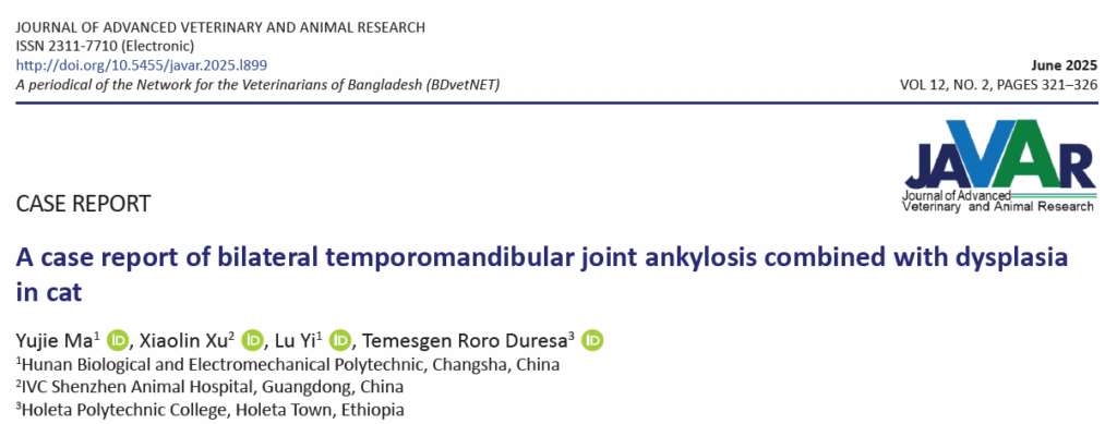 文献来源:Ma Y, Xu X, Yi L, Duresa TR. A case report of bilateral temporomandibular joint ankylosis combined with dysplasia in cat. J Adv Vet Anim Res. 2025 Apr 16;12(2):321-326.