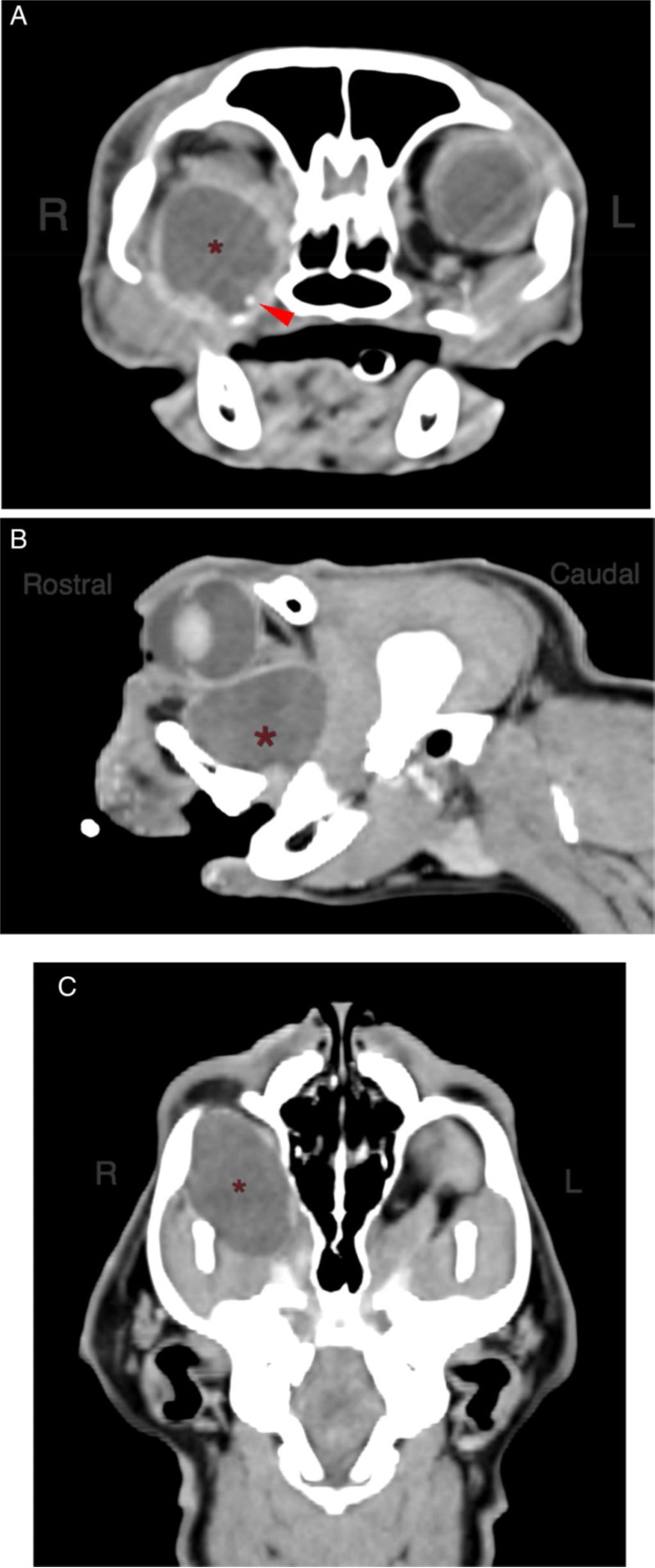 图1. 软组织窗下的增强后横断面(A)、矢状面(B)和背侧面(C)的CT图像。右眶后间隙有一个边界清晰的占位性病变(红色星号),将眼球向前上方推移。红色箭头表示肿块内的矿化结构。