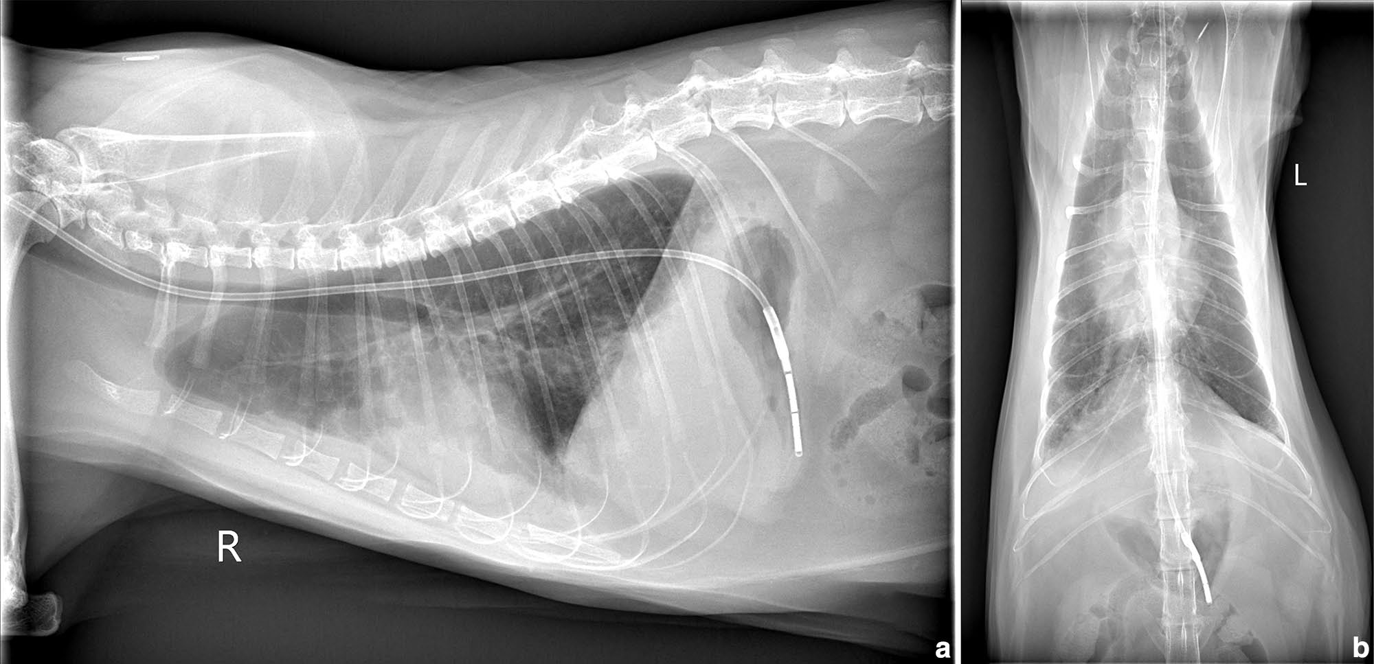 图1. 胸部X线片(a)侧位:弥漫混合性肺征,间质、支气管及肺泡病变以后叶最显著,伴轻度胸腔积液及中度心脏影增大。(b)背腹位:更清楚显示胸腔积液及肺、心细节。