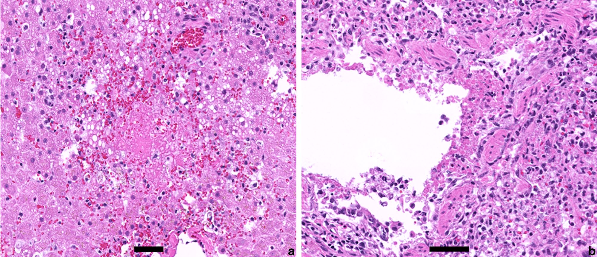 图3. 光学显微照片(a)肝实质坏死,肝细胞消失,代之以大量外渗红细胞、纤维素及细胞与核碎裂碎片。(b)小支气管节段性坏死,上皮细胞脱落,表面附着纤维素丝。