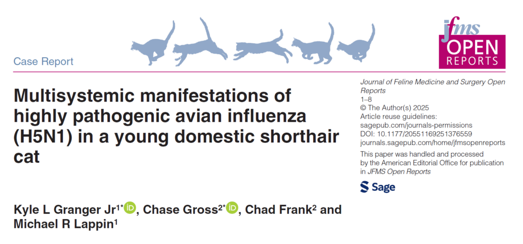 文献来源:Granger KL Jr, Gross C, Frank C, Lappin MR. Multisystemic manifestations of highly pathogenic avian influenza (H5N1) in a young domestic shorthair cat. JFMS Open Rep. 2025 Nov 11;11(2):20551169251376559.