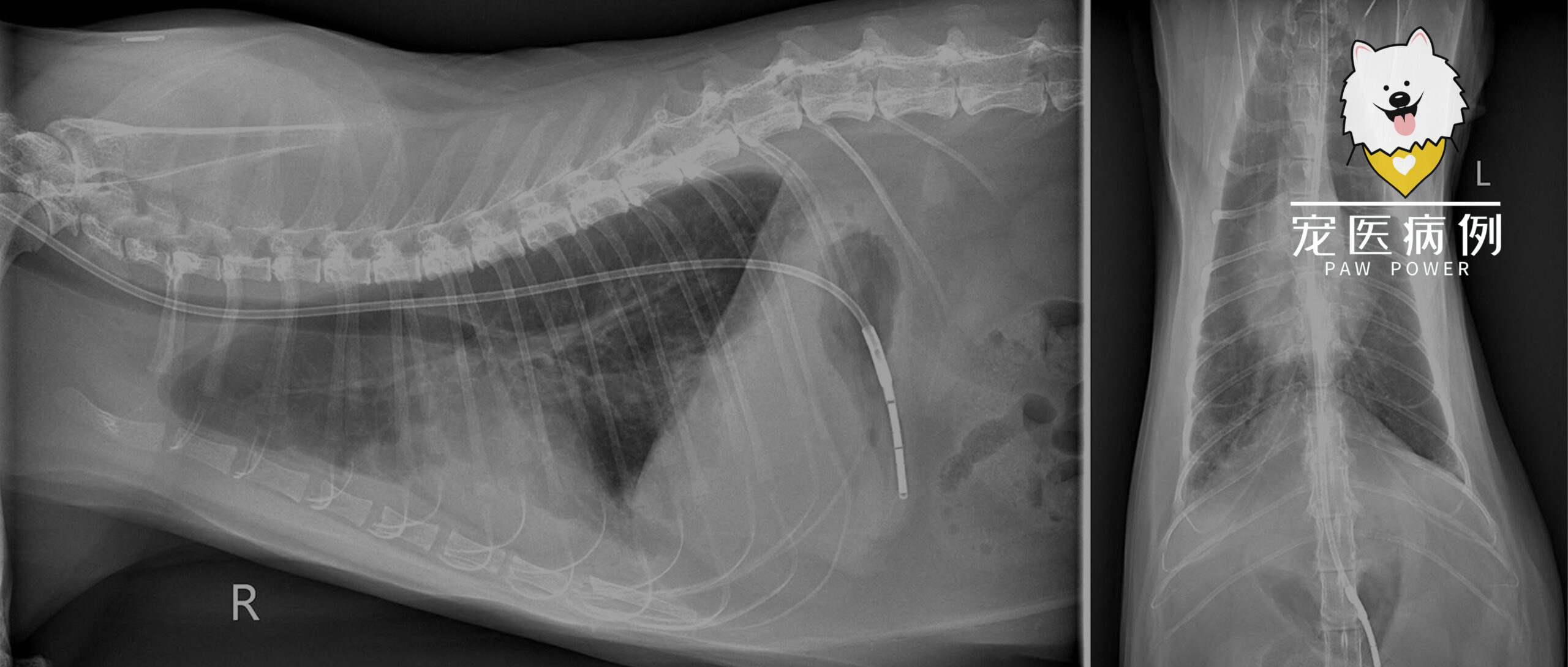 体重5.9 kg。精神沉郁,呼吸急促(100次/分),高热(41.2°C)。胸部X线呈混合性肺征,间质、支气管及肺泡均受累,后叶最严重(图1)。轻度胸腔积液与心脏增大,提示心肺疾病。