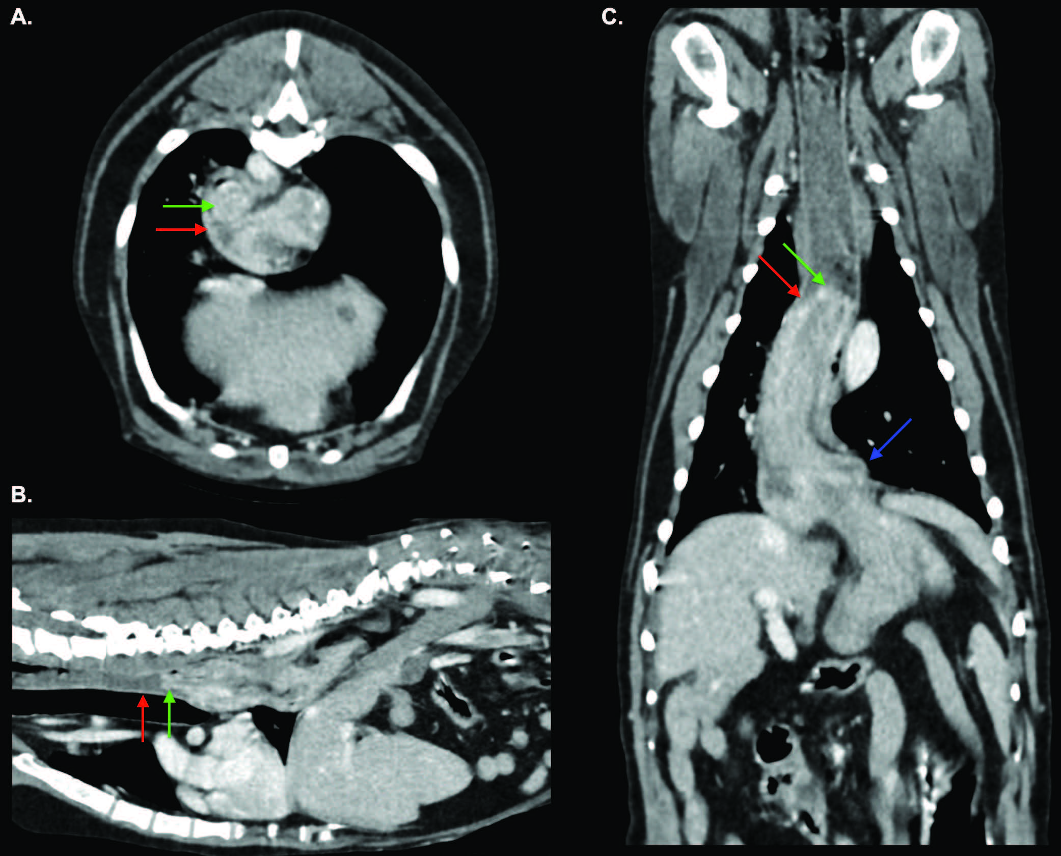 图1. 静脉期横断(A)、矢状(B)与背侧(C)图像。部分胃底(绿箭头)经食管裂孔向前疝入胸段远侧食管(红箭头)。胃食管连接部(蓝箭头)位置正常。更近端胸食管被少量混杂密度、液-软组织性腔内物质轻度撑开。所见符合胃食管套叠。