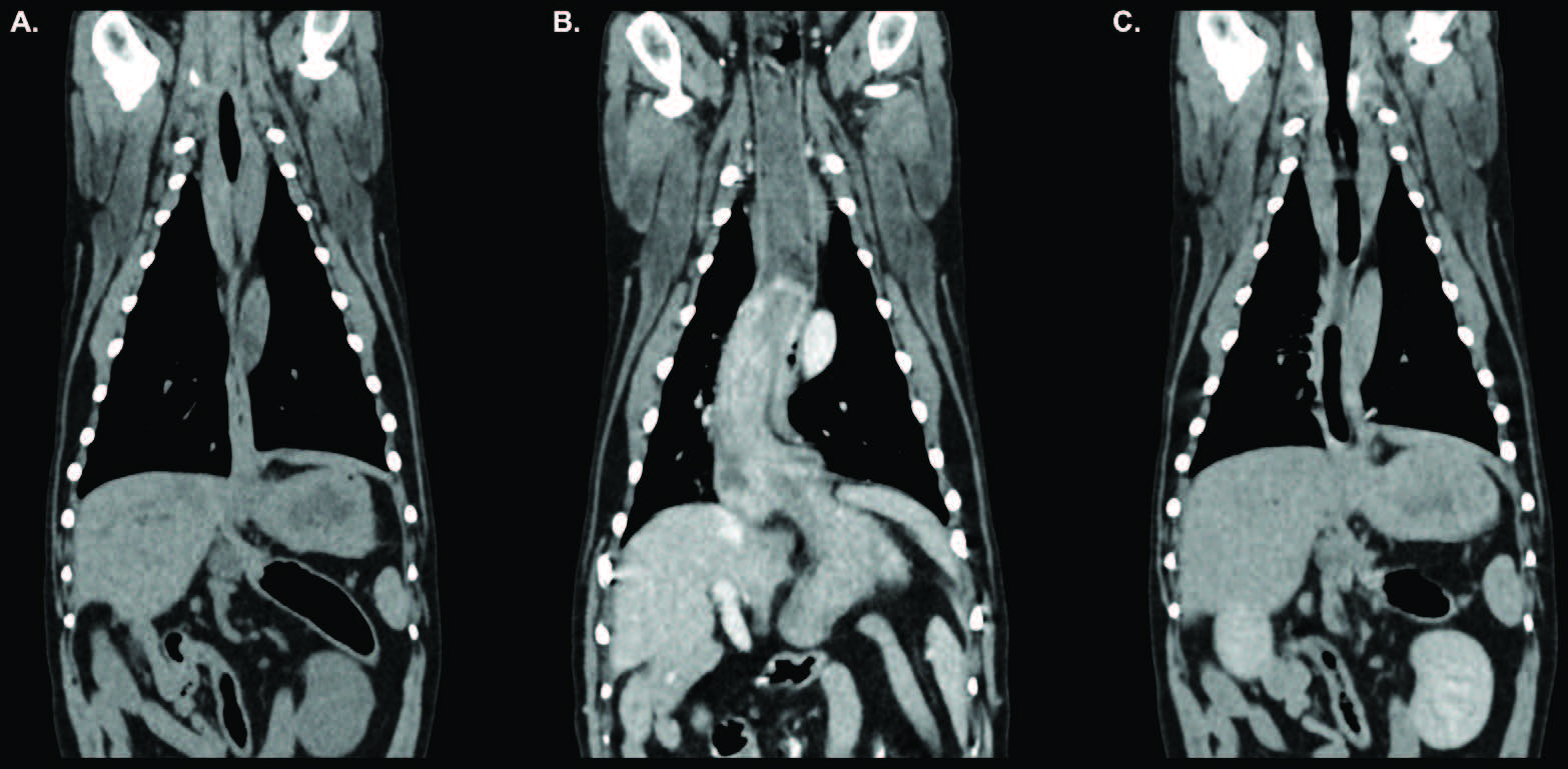 图2. 检查过程中获得的胸廓和腹腔前部的背侧重建图像,分别显示平扫期(A)、静脉期(B)和延迟期(C)。在平扫期(A)和延迟期(C)图像中,胃位置正常,食管扩张不明显。在静脉期(B)图像中可见胃食管套叠,具体标注见图1。