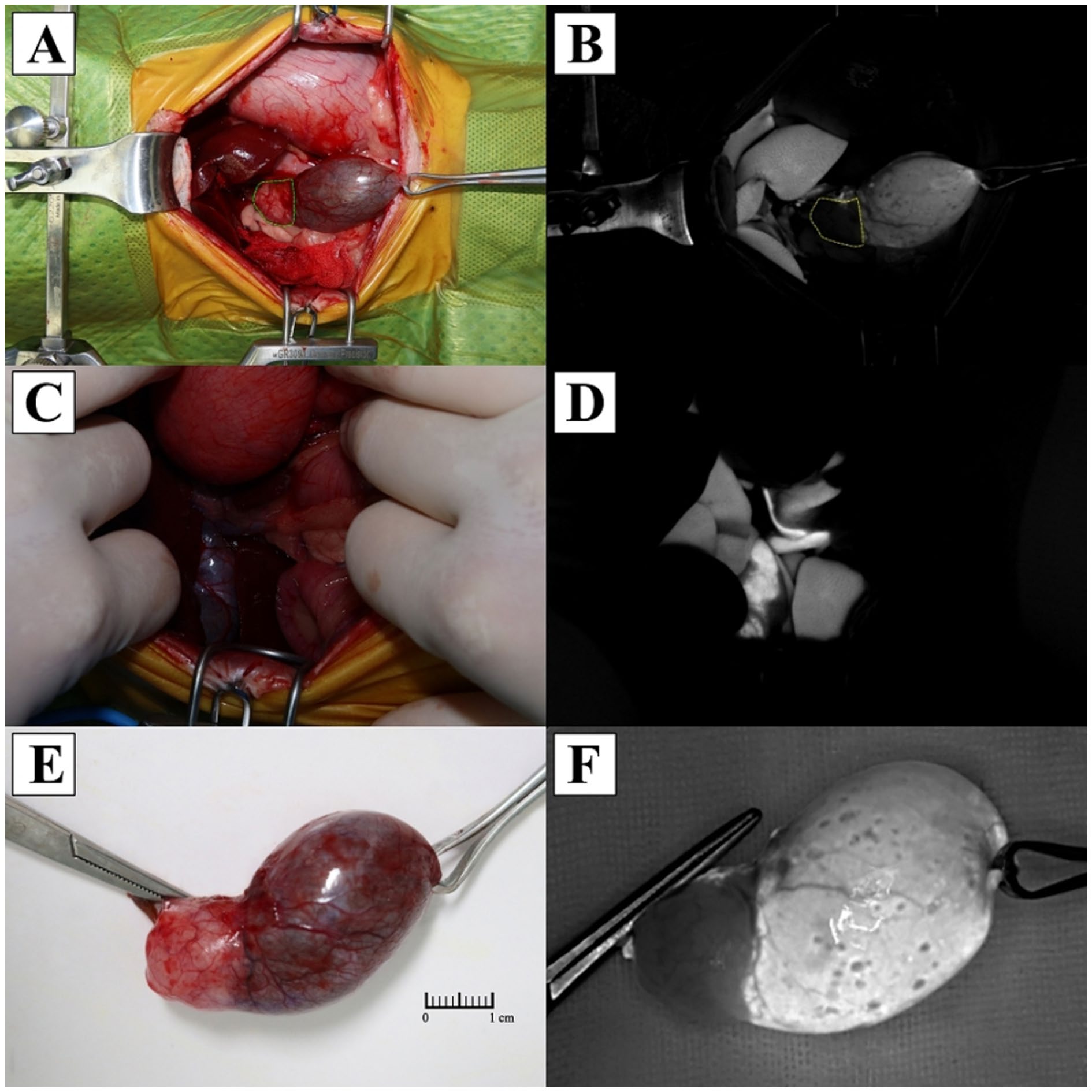 图2. (A) 分离后胆囊及肿瘤(绿色虚线)的术中标准视野。(B) 肿瘤部位充盈缺损的吲哚菁绿荧光(黄色虚线)。(C) 胆道术中标准视野。(D) 胆道的吲哚菁绿荧光。(E) 切除胆囊的大体标本。(F) 使用吲哚菁绿对切除胆囊进行的近红外荧光成像。