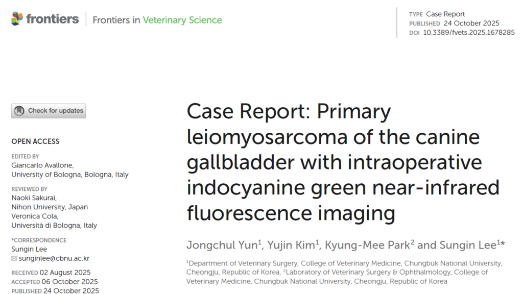 文献来源:Yun J, Kim Y, Park KM, Lee S. Case Report: Primary leiomyosarcoma of the canine gallbladder with intraoperative indocyanine green near-infrared fluorescence imaging. Front Vet Sci. 2025 Oct 24;12:1678285.
