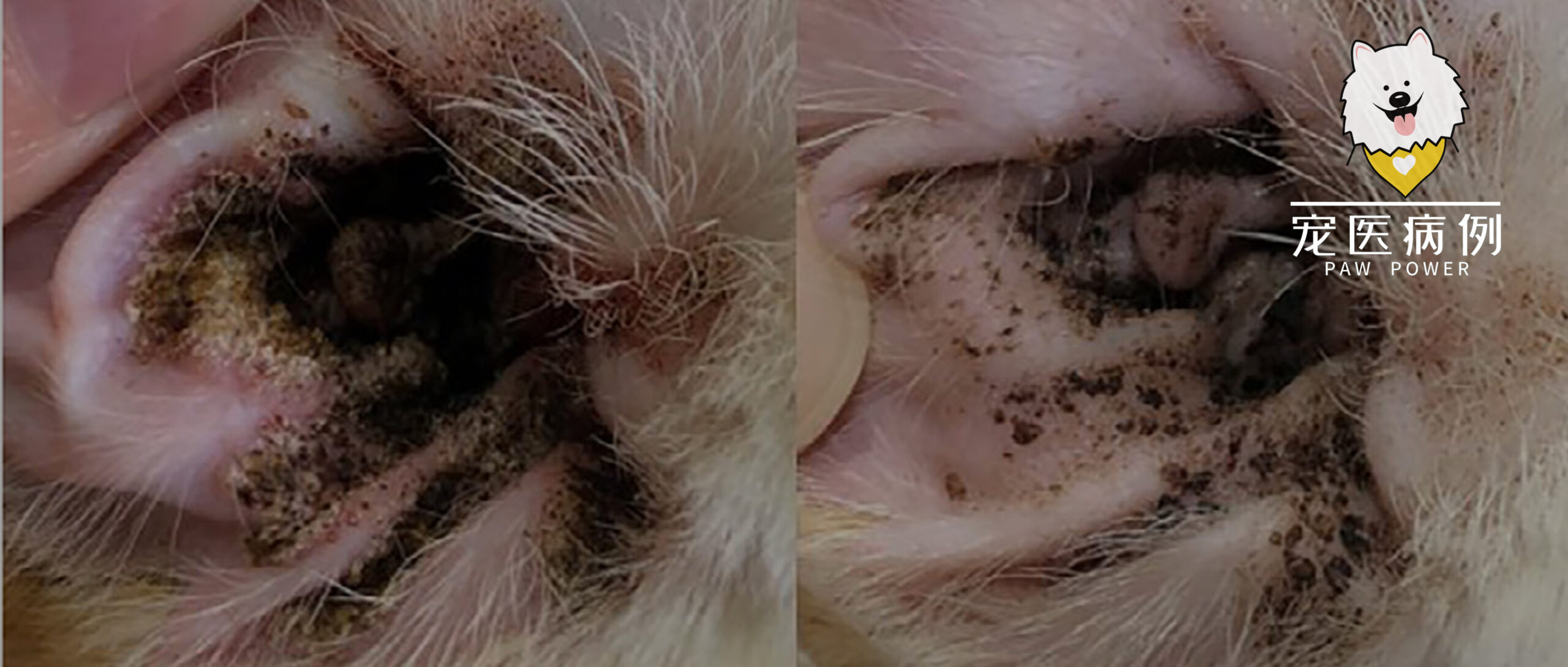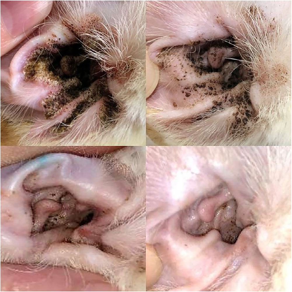 精神活泼、体况良好(体重3.86 kg,体况评分5/9)。双侧外耳道至垂直耳道可见明显粘附性痂皮,覆盖于红色斑块之上,耳垢分泌物延伸至深层水平耳道(图1,左上)。其余常规体格检查未见异常。