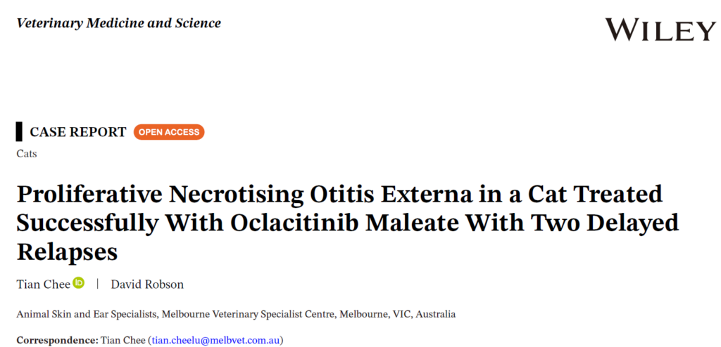 文献来源:Chee T, Robson D. Proliferative Necrotising Otitis Externa in a Cat Treated Successfully With Oclacitinib Maleate With Two Delayed Relapses. Vet Med Sci. 2025 Nov;11(6):e70696.