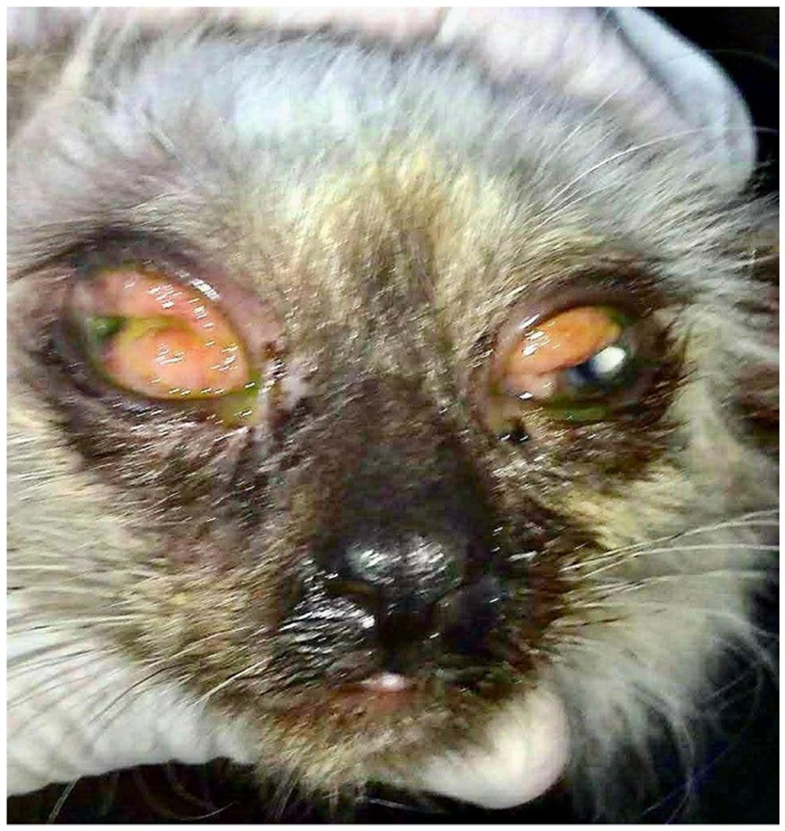 体重300克。观察到明显的双侧结膜充血,呈肉芽肿样外观,伴有淋巴滤泡、结膜水肿和黏稠的黏液脓性分泌物(图1)。